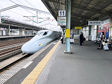 ▲新山口駅に到着。遅れは7分ほどで乗り継ぎに