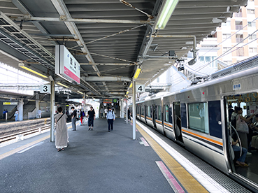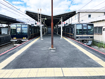 ▲四条畷駅で快速から各停にのりかえ。