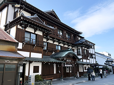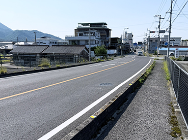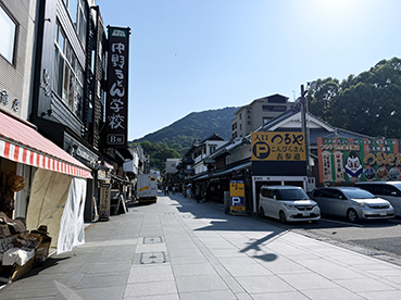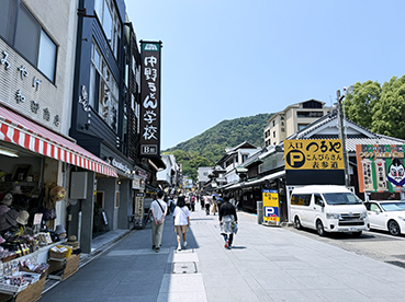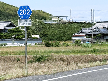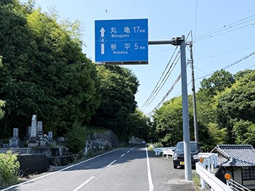▲歩くこと1時間と少しで琴平の町が見えてきた。