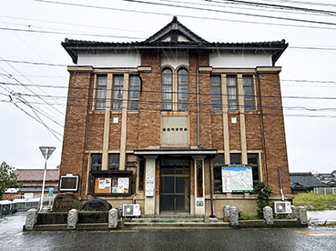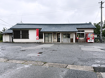 ▲激しい雨の中、ポンチョを着て歩く。 駅に行く前に「旧都野津町役場」に寄る。