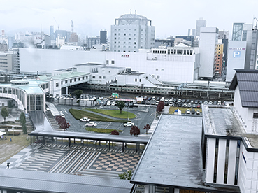 から見た山形駅。雨模様。