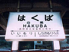 ▲現駅舎。昭和45(1970)年12月改築。駅舎の2階は宿泊施設になっています。登山、スキーなど観光客が絶えず、周辺も土産物屋、飲食店が軒を連ねています。 昭和7(1932)年11月に「信濃四ツ谷(しなのよつや)」として開業、昭和43(1968)年10月に「白馬」に改称しています。(2002.7撮影)