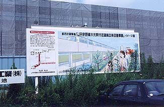 ▲高架事業の説明案内板。大元駅の前後約3.2キロが高架化されるとあります。道路の渋滞解消のための高架化です。
