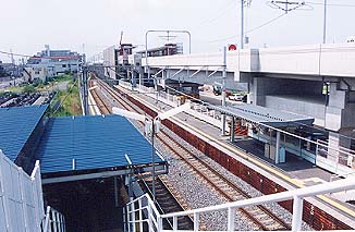 ▲旧駅の跨線橋から宇野方面を見たところ。画面左の青い屋根が旧仮駅舎。画面中央上部が新駅の位置です。 |