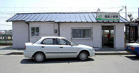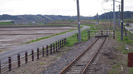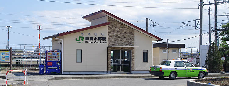 ▲震災以来、不通になっていましたが、平成24(2012)年3月に石巻方からここまでが仮復旧、同時に新駅舎も使用開始になりました。車両はディーゼルカーでホームは片面使用です。(2012.5影)