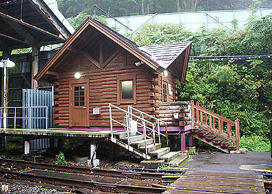 ログハウスの待合室が設けられています。右写真の手前のログハウスはトイレです。(2007.9撮影)