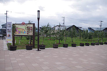 ▲広い駅前広場の一角には夏でも雪体験ができる「低温熟成施設」、10種類ものりんごの木が植えられている「りんご園」があります。(2011.8撮影)