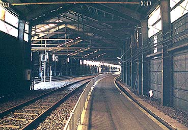 ▲ホームからは旧線に沿って長い通路が続いています。(2005.5撮影)