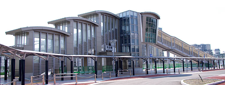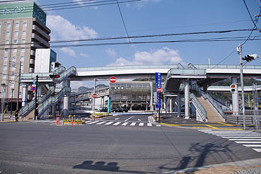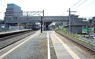 ペデストリアンデッキは平成21(2009)年12月に完成しました。駅前にホテル、コンビニあり。(2008.4撮影)