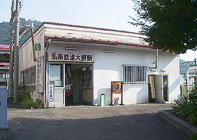に隣接して独立した駅舎があります。右の写真はホームから見た弘南鉄道駅舎。