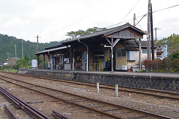 ▲昭和9(1934)年1月で開業時の駅舎。周辺は古い町並みが保存されています。駅前食堂あり。