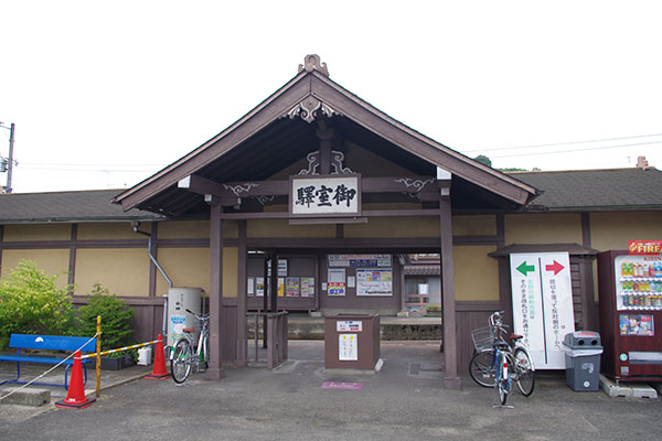 ▲入口には懸魚(げぎょ)もぶら下がっていて結構手が込んでいます。旧駅名のままなのは、新駅名が長くてバランスが悪いのか、それとも旧駅名板が由緒あるものなのかどちらかでしょう。(2011.7撮影)