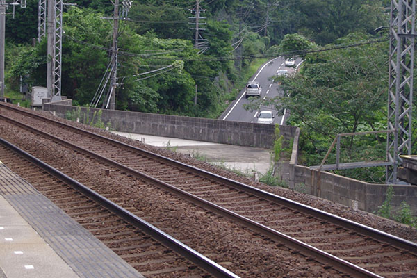 ▲駅裏の国道に出ます。正面が駅に続く道。(2011.8撮影)