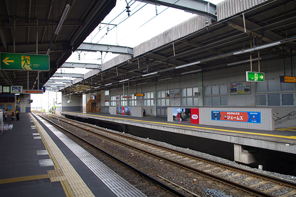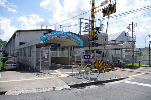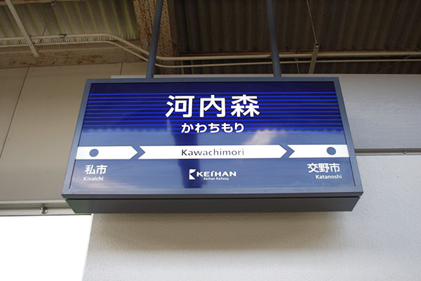 ▲駅入口。線路を挟んだ両方に入口があり、改札・コンコースは地下にあります。 平成4(1992)年2月に地下化されました。 JRの河内磐船駅まで約200メートルで、乗り換える客も多いです。(2011.7撮影)