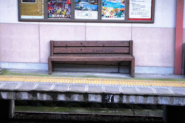 ▲ホームのベンチ。左右の脚の長さにかなりの差がありますが、これで座面が水平になることから、いかにホームが急勾配であるかが分かります。(2011.7撮影)