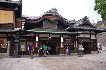 ▲土産物屋や飲食店の並ぶ商店街と「道後温泉本館」。(2011.7、2012.6撮影)