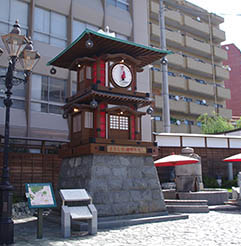 中:駅舎の前の放生園(ほうじょうえん)と呼ばれる一角にあるからくり時計。毎時00分になるとからくりが作動します。