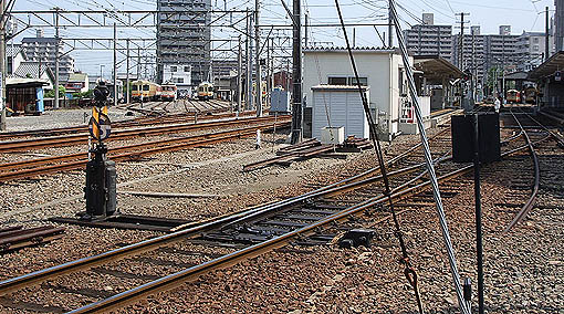 ▲車庫もありいろいろな車両や複雑な線路配置が見られ、飽きの来ない駅です。